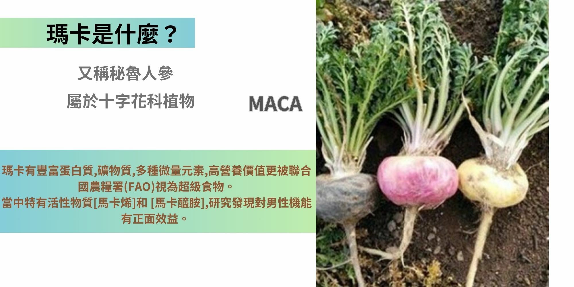 透過現今醫學對瑪卡的深入研究,人們發現瑪卡中含有 20 種氨基酸、 7 種礦物質及 8 種維生素等豐富營養成分,而其中僅存於瑪卡內的瑪卡烯(Manaenes)及瑪卡醯胺(Macamides),則是被認為能有效促進男性魅力、強健身體的營養成分之一。